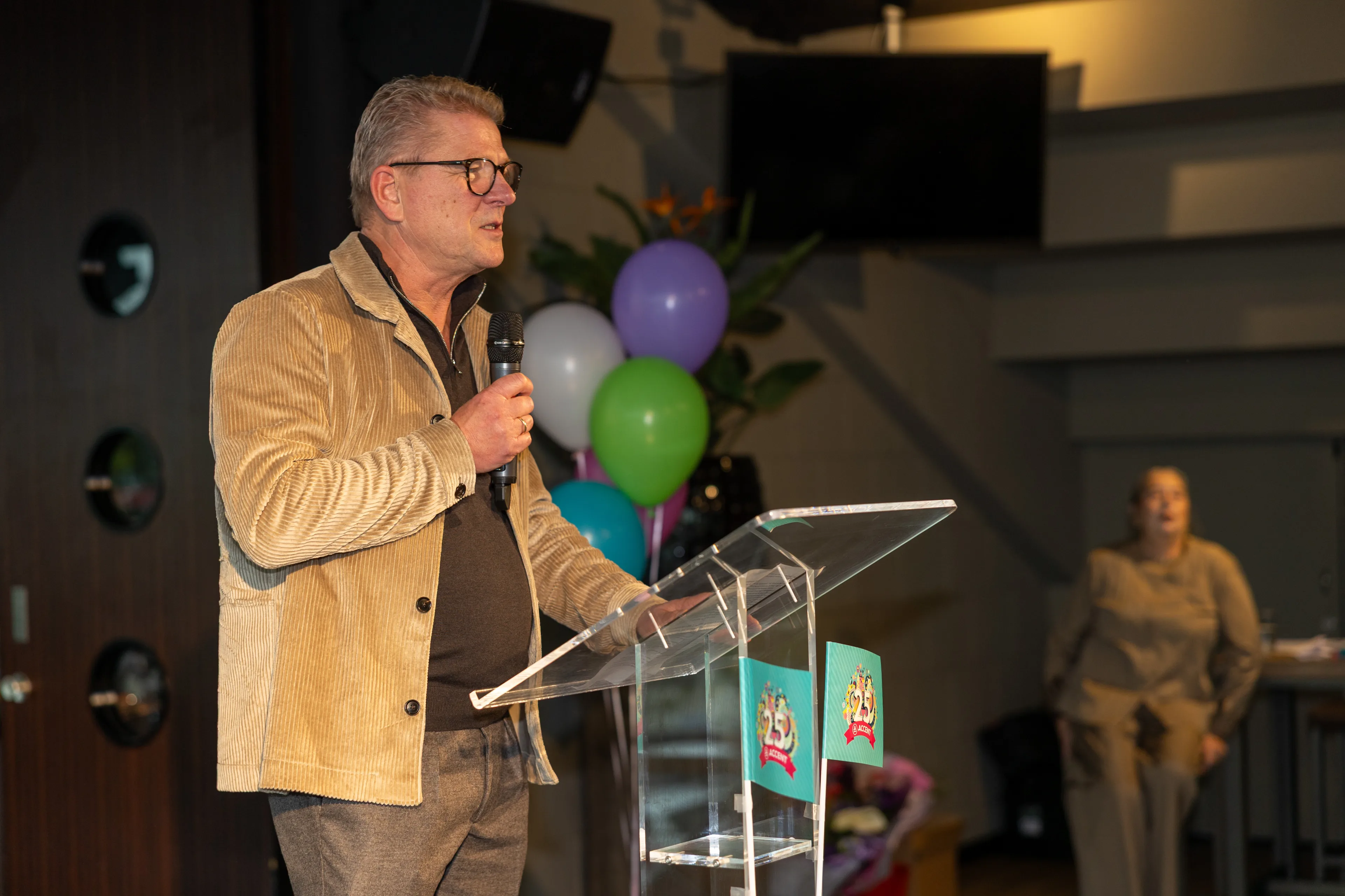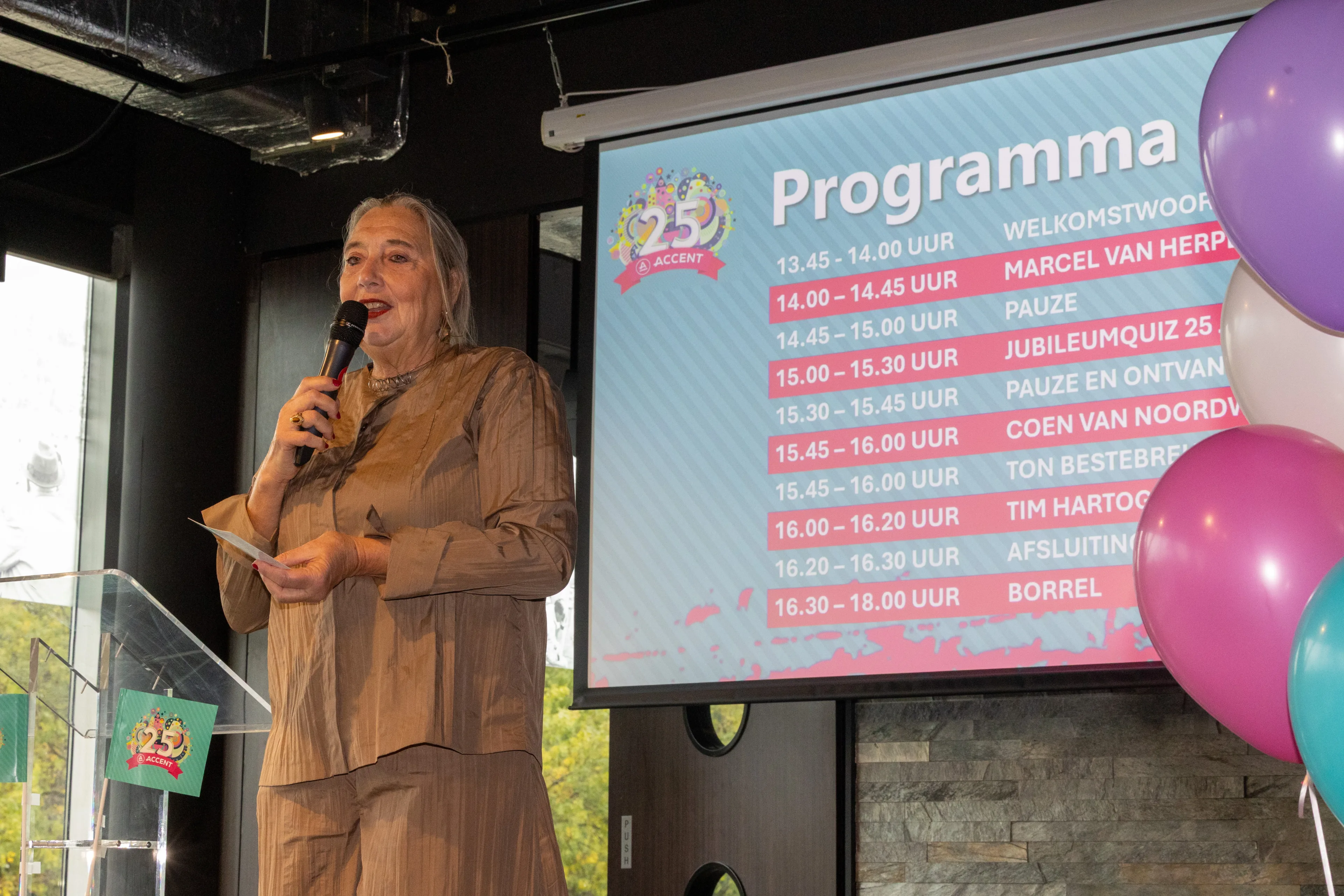 In ‘Het Kasteel’ van Sparta Rotterdam sloot Accent op donderdag 16 oktober een jaar vol feestelijke activiteiten af. Bij deze jubileumviering waren niet alleen medewerkers, maar ook relaties van Accent uitgenodigd. De middag begon met een lunch voor de medewerkers van Accent. Het programma werd begeleid door dagvoorzitter Yvonne Laging, die vervolgens het woord gaf aan Ella Noordhoek voor een openingswoord, waarin zij terugblikte op het afgelopen jubileumjaar. De eerste spreker, Marcel van Herpen, benadrukte dat verbondenheid in het onderwijs begint bij echte aandacht en relatie: kinderen leren pas echt als ze zich gezien en veilig voelen. Vervolgens zorgde de jubileumquiz over 25 jaar Accent van Paul Chung, voor een competitieve én hilarische sfeer, waarbij de lachspieren goed werden getraind, verbondenheid centraal stond en iedereen er ook nog iets van opstak.